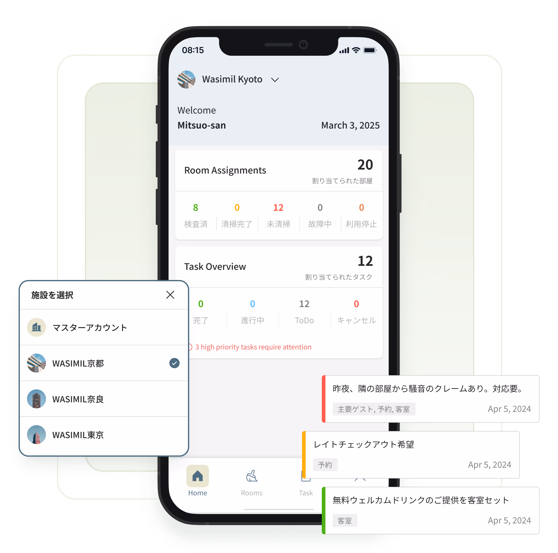 客室ごとのメモや特別な指示を作成・共有。 情報の伝達ミスを防ぎ、サービス品質とチーム連携を確実に。