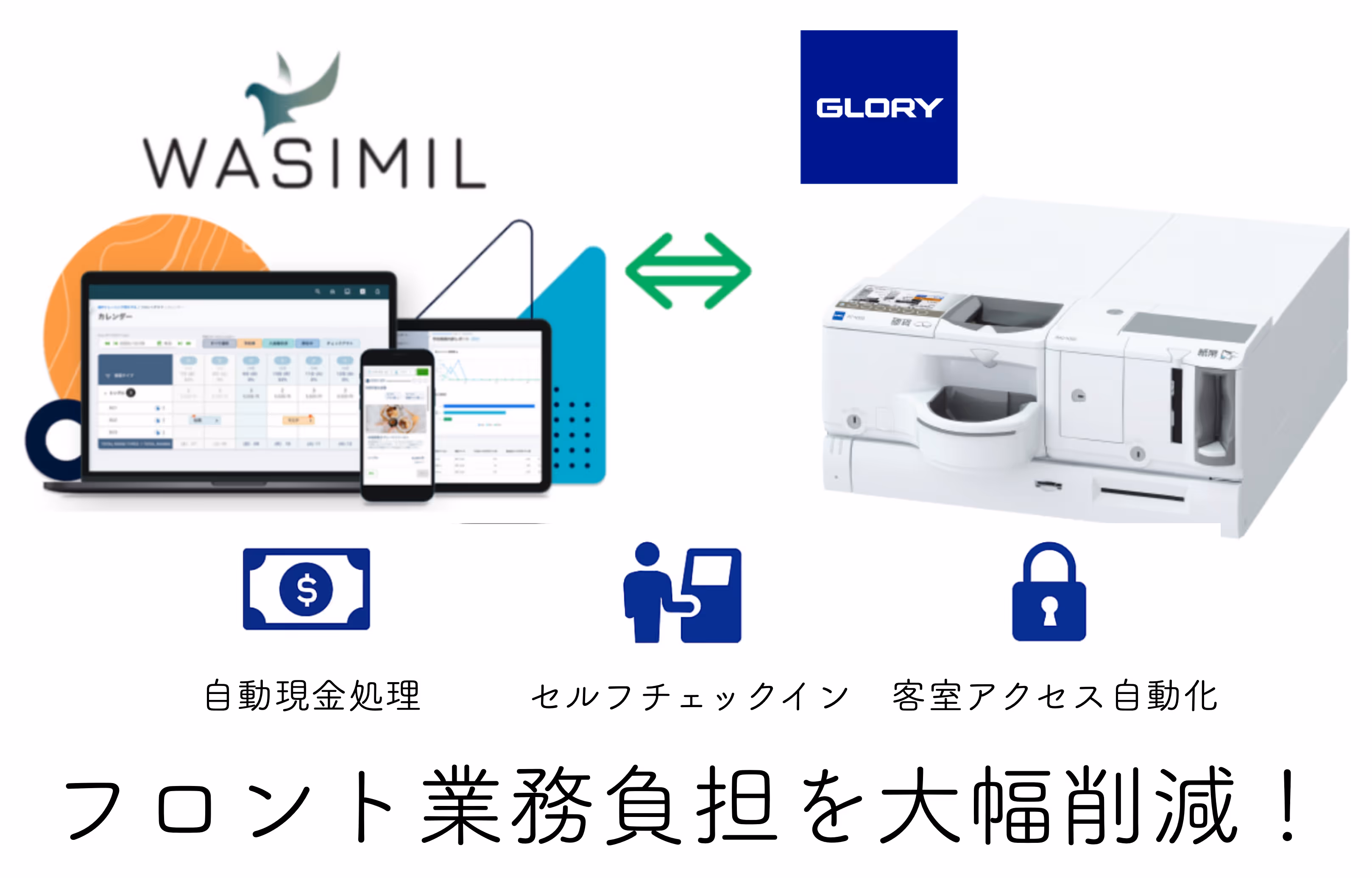 本連携により、『WASIMIL』と自動つり銭機N300シリーズがリアルタイムでデータ連携し、セルフチェックイン時の現金決済を完全自動化。