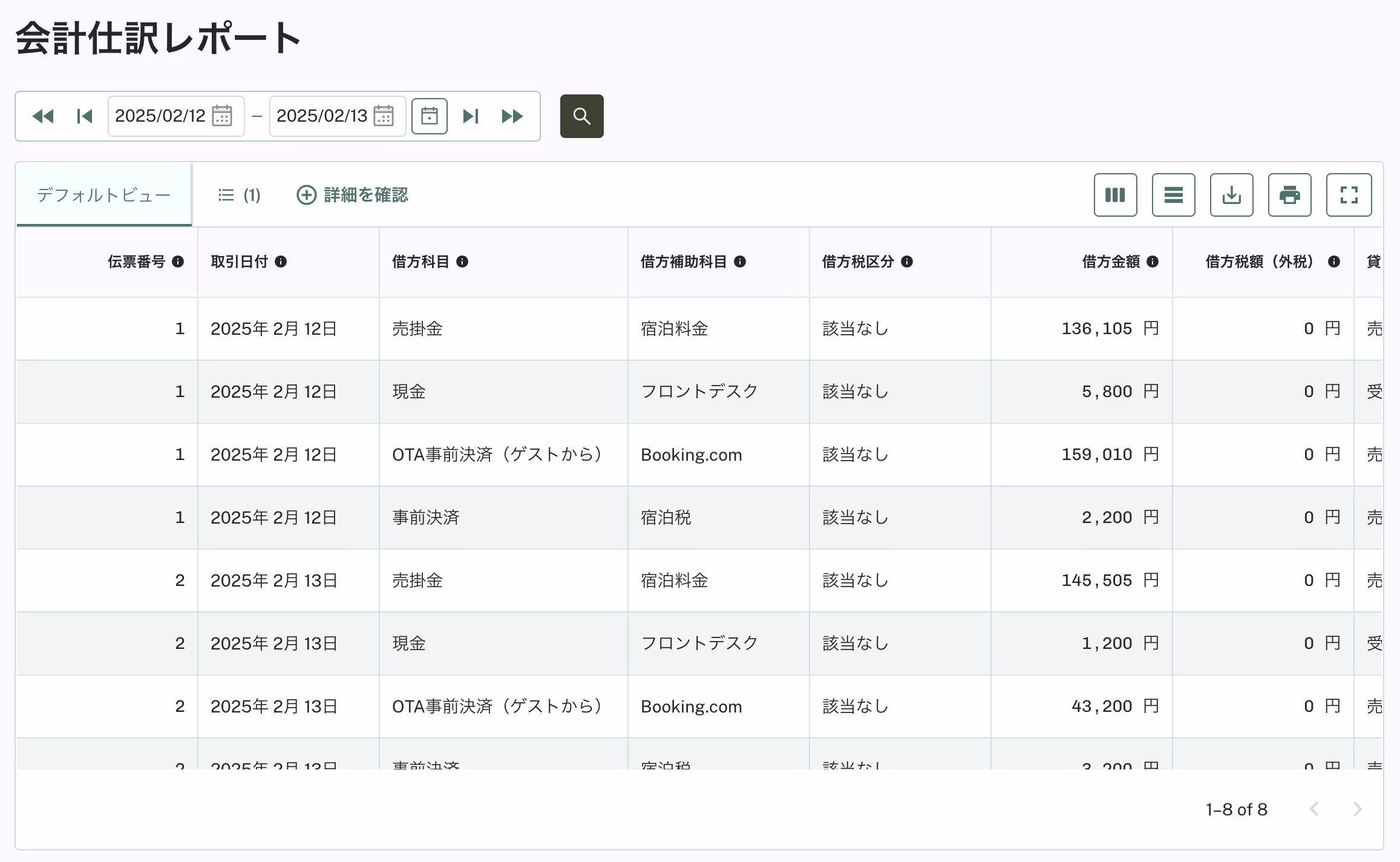 本レポートはWASIMILのPMS管理画面より「レポート > 会計帳票 > 会計仕訳レポート」からいつでも確認可能です。